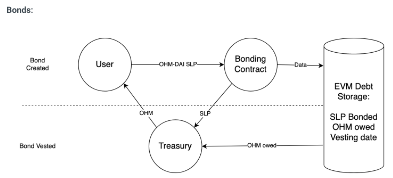 债券商的主要好处来自价格的一致性。债券人预先承诺资本,并承诺在设定的时间点获得固定回报;该回报以 OHM 计,因此债券到期时债券持有人的利润将取决于 OHM 价格。债券商受益于上涨或静态的 OHM 价格。当用户从中获得的回报大于质押的回报时,他们就会有债券化的动机。目前只有ohm-dai、ohm-eth。Bond则提供 LP 或 DAI 代币以在固定归属期后换取打折的 OHM 代币。